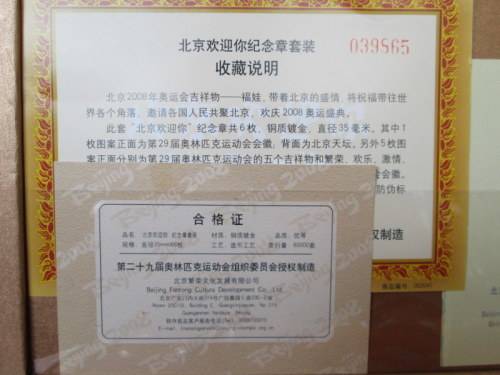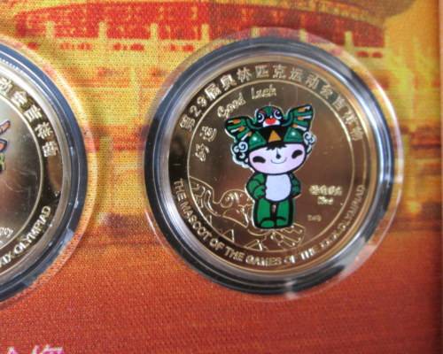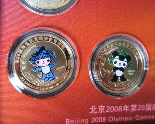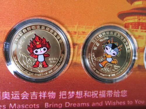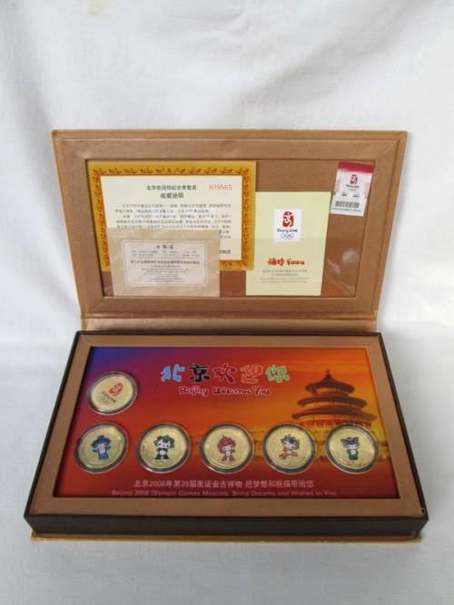 "Beibei, Jingjing, Huanhuan, Yingying, Nini", Prosperity, Happiness, Passion, Health and Good Luck. Advanced technique, this set carries an anti-counterfeit label and serial number. A scarce set it makes a great gift for collectors of Olympic coins. This full set is in very good condition with wear to the box only.
