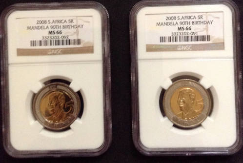 2008 MANDELA 90TH BIRTHDAY MS66 X 2 COINS, ONE PRICE FOR TWO.