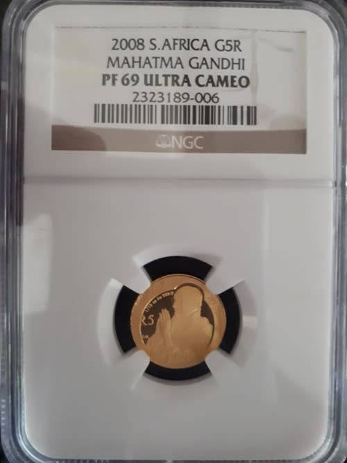 2008 One Tenth oz (R 5 ) Gold Protea Mahatma Gandhi Ultra Cameo PF69