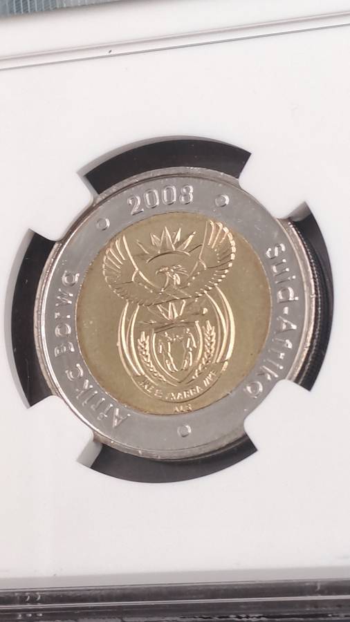 Features Issuer South Africa Period Republic (1961-date) Type Circulating commemorative coin Year 2008 Value 5 Rand (5 ZAR) Currency Rand (1961-date) Composition Bimetallic: brass center in copper-nickel ring Weight 9.5 g Diameter 26.0 mm Thickness 3.0 mm Shape Round Technique Milled