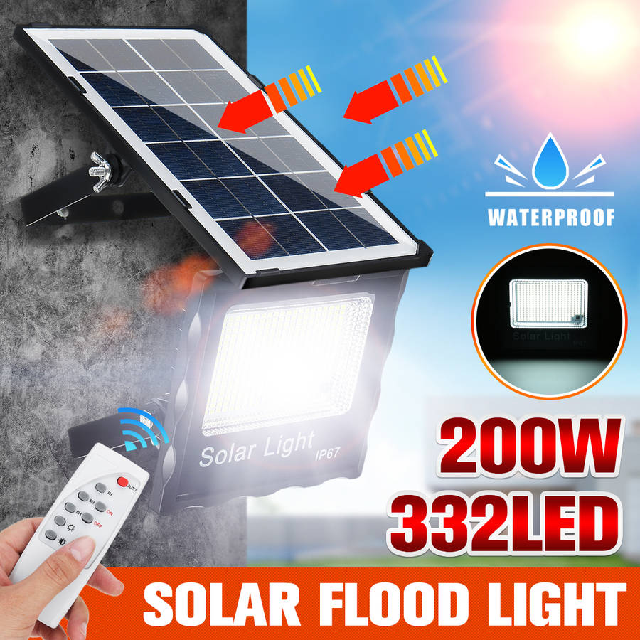 Specification: Power: 200W LED: 332LEDs Illuminated Area: 50㎡ Battery capacity: 8000mAh Lighting time: 12hours Shell Material: Nylon+Glass mirror Solar panel size: 22*13.5cm/8.66*5.31' Flood light size: 14*12.5cm/5.51*4.92' Cable length: 2.5m Waterproof Grade: IP67 Function: Remote Control/the lights come on after dark Use occasions: Courtyard, Stadium, Indoor and outdoor