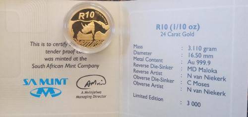 2010 BLACK RHINO 24 CARAT 1/10TH OZ GOLD COIN WITH COA!!!