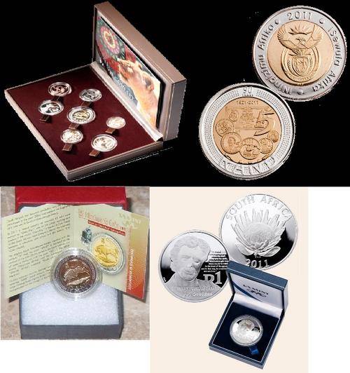2011 Proof Set, 2011 Oom Paul, 2 X 2011 SARB R5 coins from SA Mint, 2011 J.M. Coetzee Protea R1