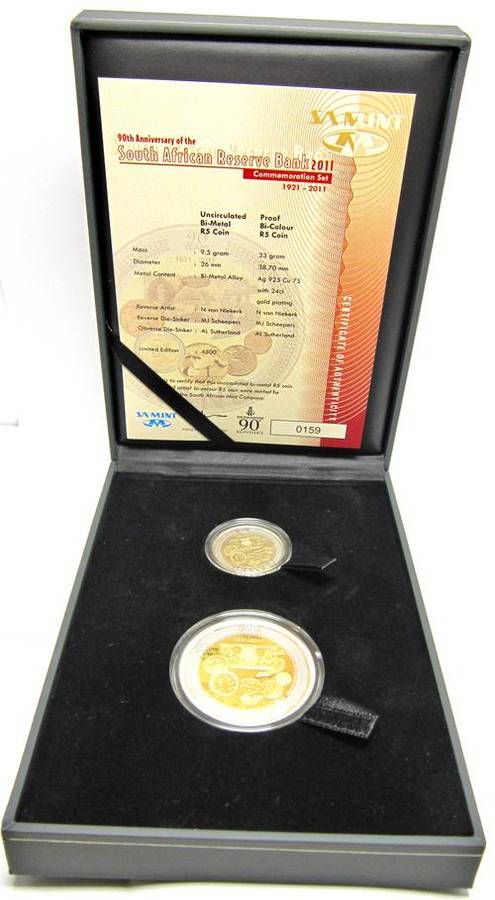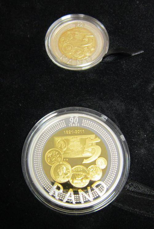 This set contains the Proof Sterling Silver with 24ct gold plating, Bi-colour R5 coin(crown size) and an Uncirculated Bi-Metal R5 coin. Limited number of sets issued.