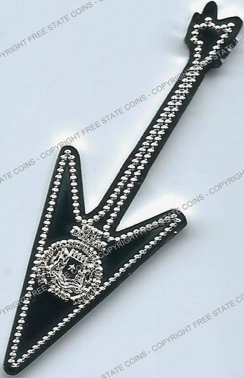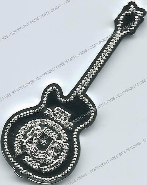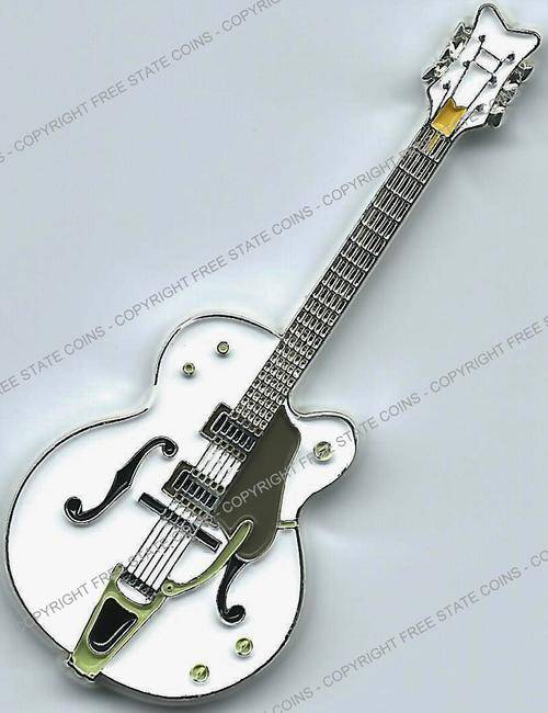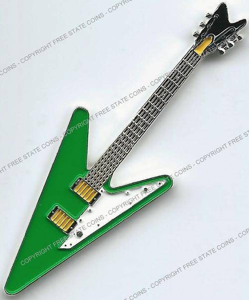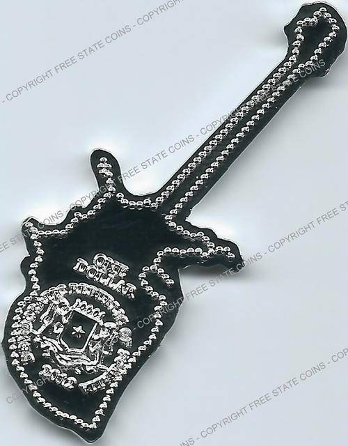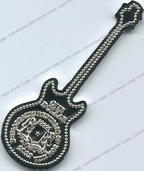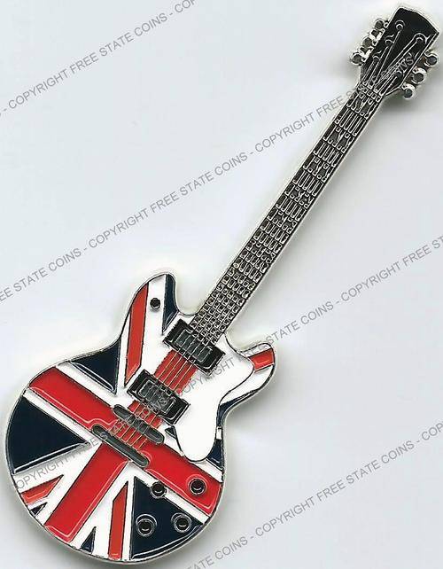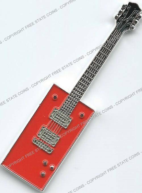 These six multi-colored coins are in the shape some of the wildest guitars around. Included is a USA map guitar, which is similar to one believed to have been used by Rick Nelson of Cheap Trick and is based a guitar produced by Gibson. The double-necked Gibson guitar is based on a style used by Jimmy Page. The red rectangular guitar is based on a style used by Bo Diddley. The Gretsch White Falcon was used by Neil Young and other. The green Gibson reverse V was used by J Mascis of Dinosaur Jr. The British Flag guitar is based on an instrument used by used by Noel Gallagher. All six coins are legal tender issues are denominated as 1 Dollar and feature the arms of the Democratic Republic of Somalia, date and denomination on the obverse. The silver-plated coins are 50mm (2 inches) long.