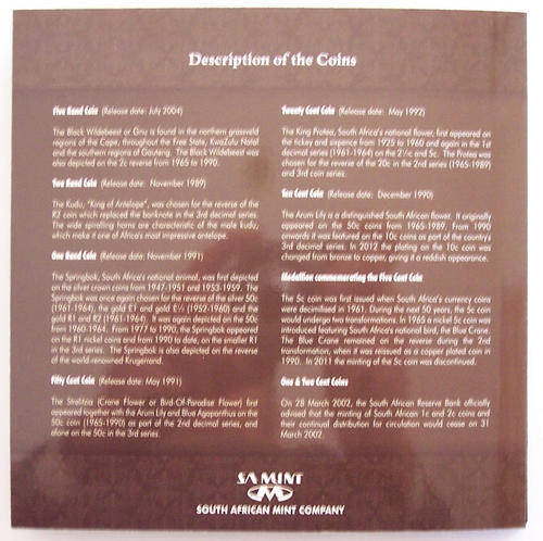 2012 UNCIRCULATED COIN SET IN ORIGINAL SA MINT PACKAGING-NO 5c AS 2011 WAS THE LAST YEAR THEY WERE MINTED-THE 5 CENT IS REPLACED WITH A COIN COMEMORATING THE 5 CENT COIN AND IS ONLY AVAILABLE IN THE OROOF AND CIRCULATION COIN SETS