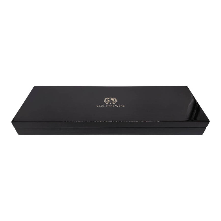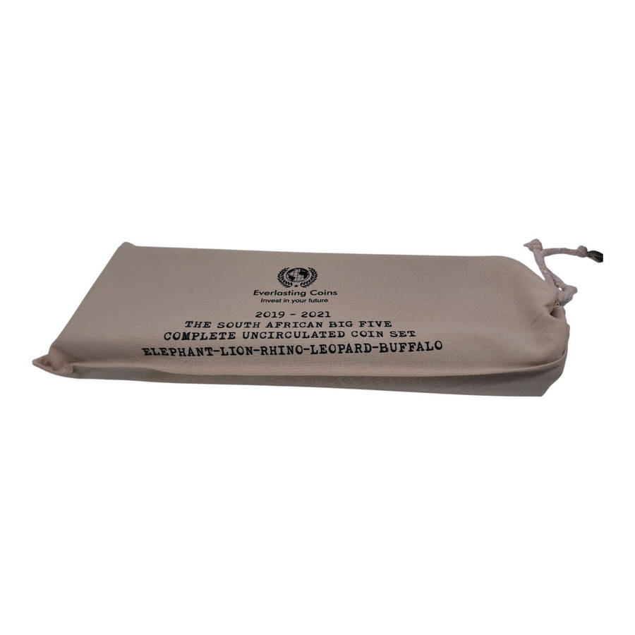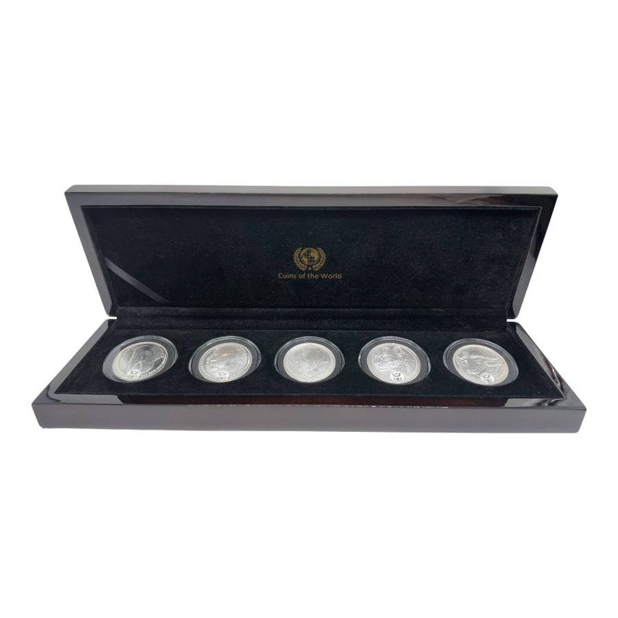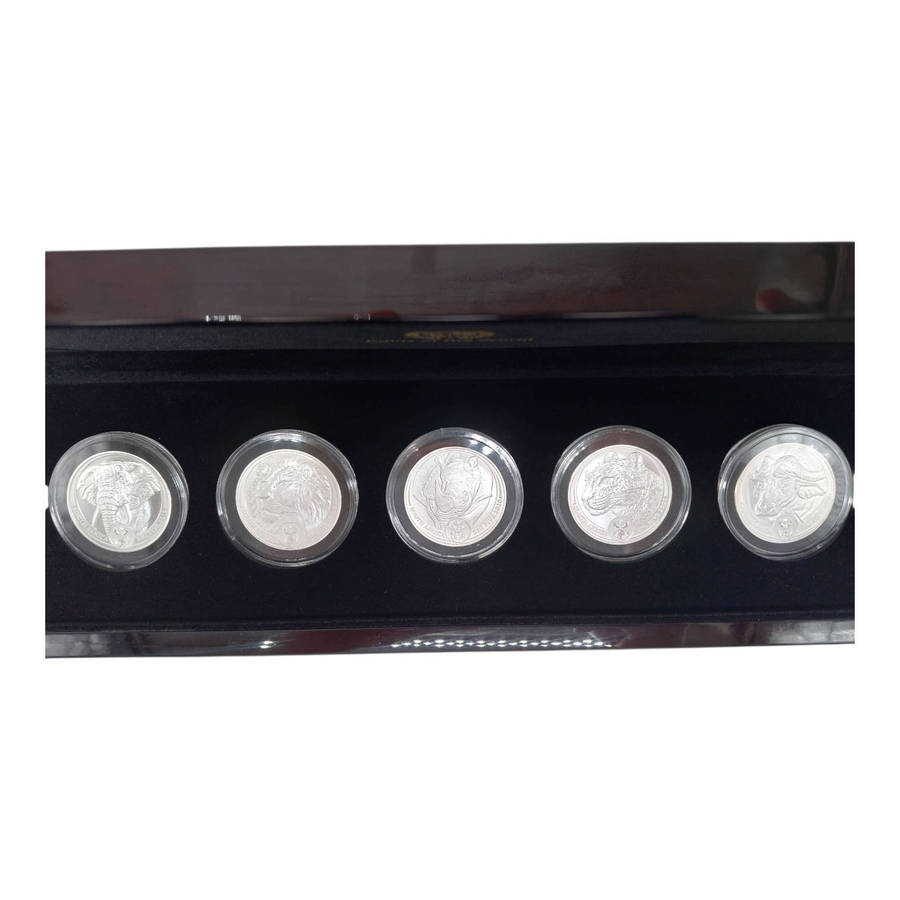 This beautifully crafted wooden presentation box houses the complete 2019 South African Big Five Silver Coin series, issued by the South African Mint. Each coin is struck in fine silver and showcases one of Africas iconic Big Five animals in exquisite detail: Lion, Leopard, Rhino, Elephant, and Buffalo.