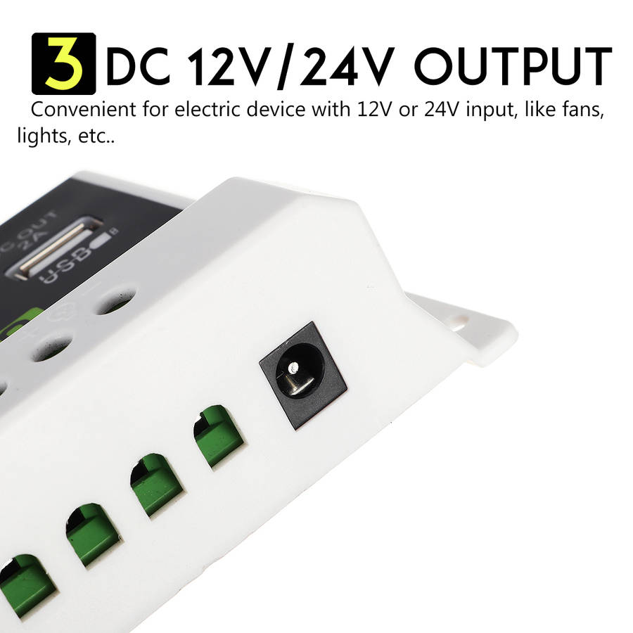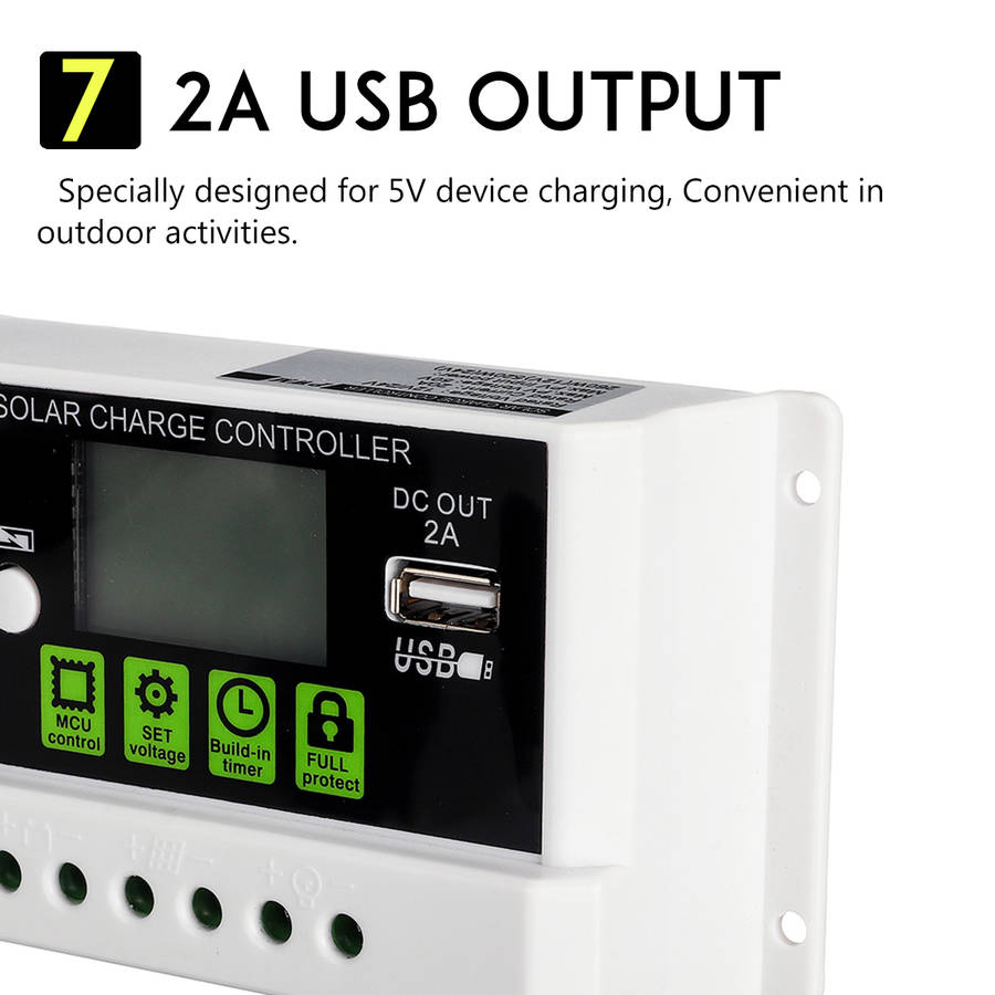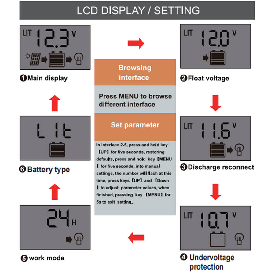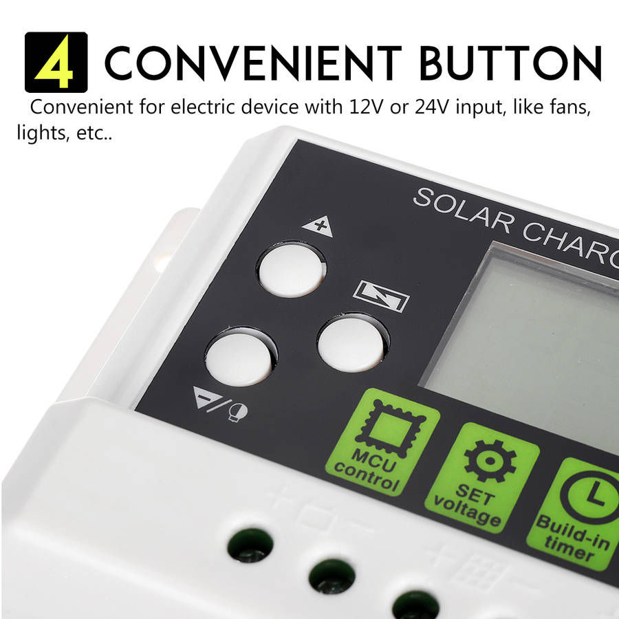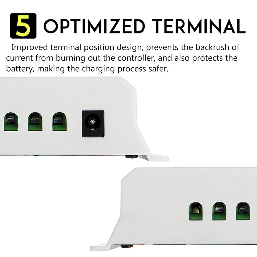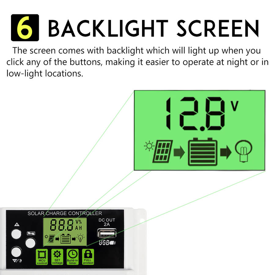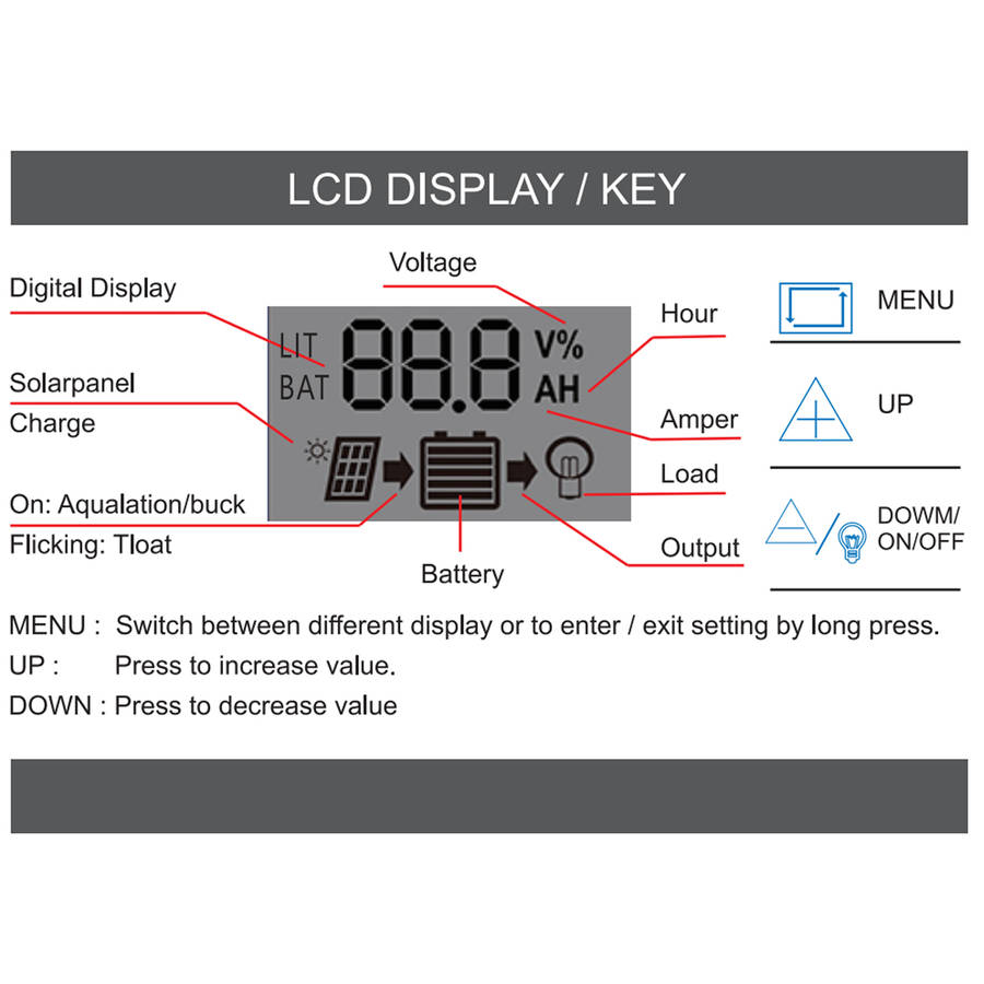 Features: Build-in industrial micro controller. Big LCD display,all adjustable parameter. Fully 3-stage PWM charge management. Build-in short-circuit protection,open-circuit protection,reverse protection,over-load protection. Dual mosfet reverse current protection,low heat production. Improved terminal position design, prevents the backrush of current from burning out the controller, and also protects the battery, making the charging process safer. The screen comes with backlight which will light up when you click any of the buttons, making it easier to operate at night or in low-light locations. Connection Steps (VERY INPORTANT): 1.Connect the battery to the charge regulator-plus and minus. 2.Connect the photovoltaic module to the regulator-plus and minus. 3.Connect the consumer to the charge regulator-plus and minus.