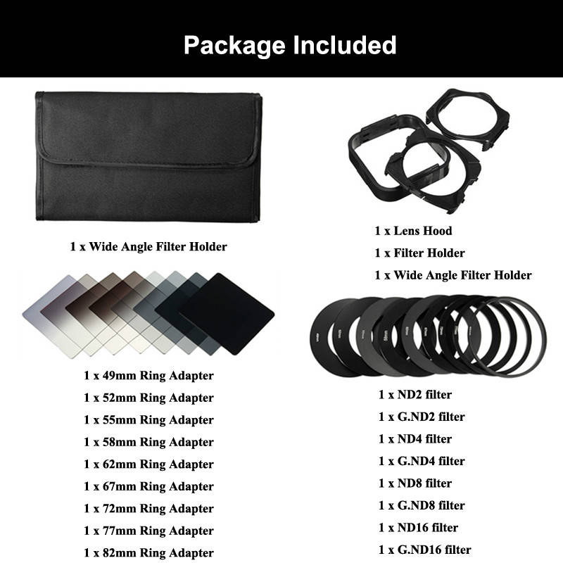 1 X G.ND2 filter 1 X G.ND4 filter 1 X G.ND8 filter 1 X G.ND16 filter 1 X ND2 filter 1 X ND4 filter 1 X ND8 filter 1 X ND16 filter 1 X 49mm Ring Adapter 1 X 52mm Ring Adapter 1 X 55mm Ring Adapter 1 X 58mm Ring Adapter 1 X 62mm Ring Adapter 1 X 67mm Ring Adapter 1 X 72mm Ring Adapter 1 X 77mm Ring Adapter 1 X 82mm Ring Adapter 1 X Lens Hood 1 X Filter Holder 1 X Wide Angle Filter Holder