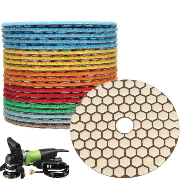 Description: 20pcs 4 Inch 50-3000 Grit Diamond Polishing Pads for Granite Stone Concrete Marble Diamond polishing pads are used for polishing, restoring/cleaning, grinding or shaping natural stone floor, cultured stone floor, concrete granite marble countertop etc with polishing tools like Wet grinder polisher, floor polisher, grinder etc. This is very handy diamond tool for Granite polishing, Concrete polishing, Marble polishing, Terrazzo polishing, engineered stone polishing, Travertine polishing and their restoration etc. These Diamond Polishing Pads are designed for good finish on Granite, Concrete, Marble, Tiles, Stones etc. Lower grit pads work fine in dry use for long time, for best results use wet.