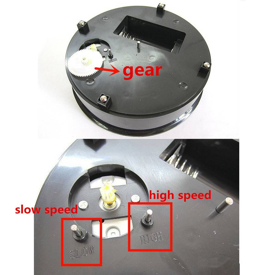 How to adjust the speed: 1. Remove the top 2. Choose the mode you need(high speed or slow speed), place the gear to the rod 3. Put the top back to the turntable, and turn on the power
