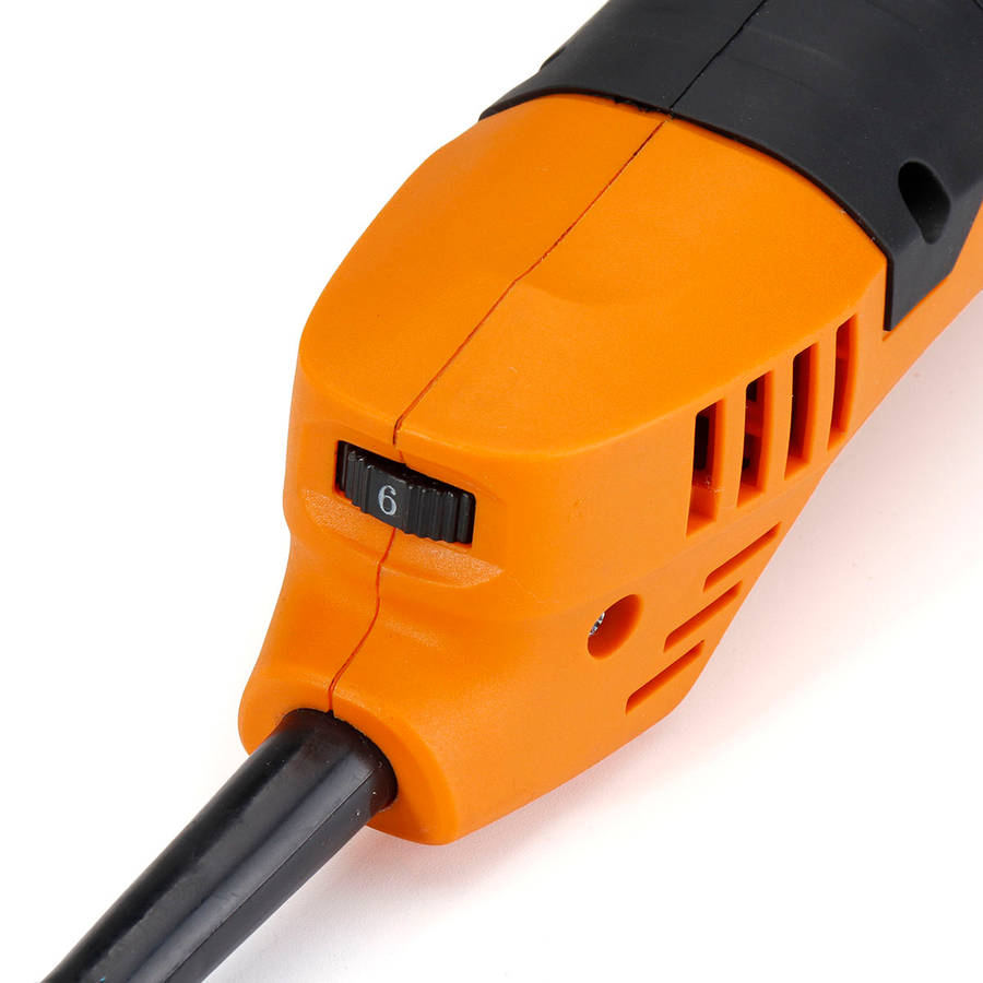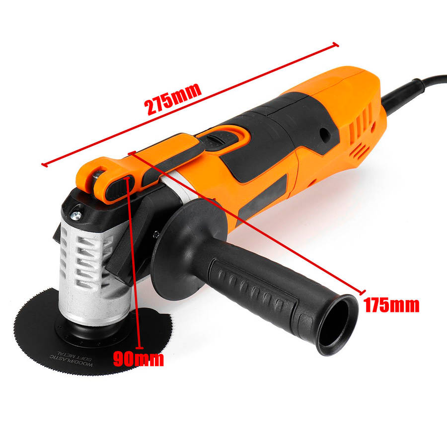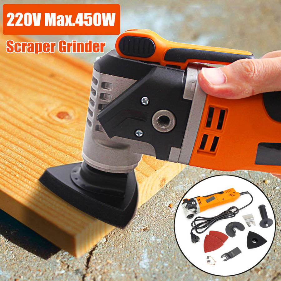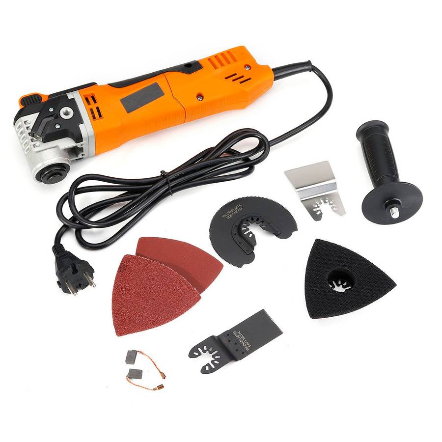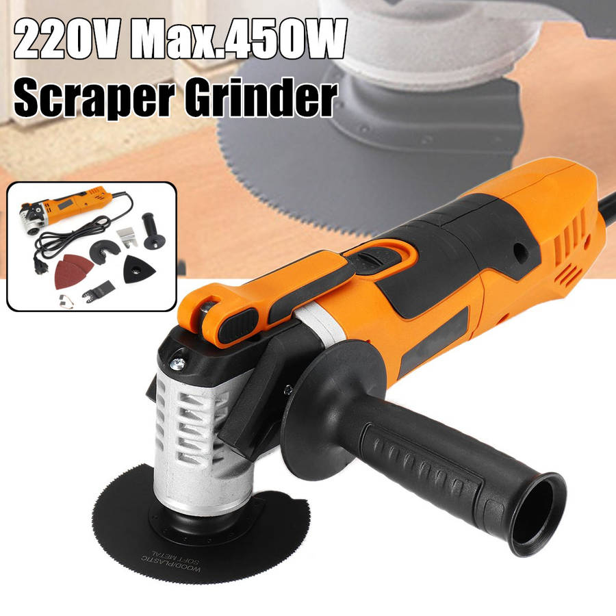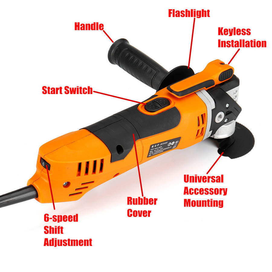 Specifications Name:Scraper Grinder Model:A97893 Color:orange+black Voltage:220V 50Hz Power:280W(peak output power:450W) Swing Frequency:11000-21000/min Swing Angle:3.2o Features -Rugged accessory seat, keyless mounting for a tighter grip. -6-speed speed control function, can be adjusted according to demand. -For the user's consideration, the handle can be installed on both sides. -It adopts universal interface and is suitable for various brand accessories. -The replacement parts do not require a hex wrench, saving time and effort. -It can be illuminated by starting the machine, and it can be applied even in low light conditions. Note:Do not use too much force on the machine, otherwise the saw blade will be easy to bite, resulting in hot burning and so on. The numb vibration will also increase a lot; the two hands will cooperate with the machine to make small reciprocating motion during operation to achieve the best cutting effect. Package Included 1 x Scraper Grinder 1 x Handle 2 x Sandpaper 2 x Ink Block 4 x Saw Blade (distribute the adapter according to your country)