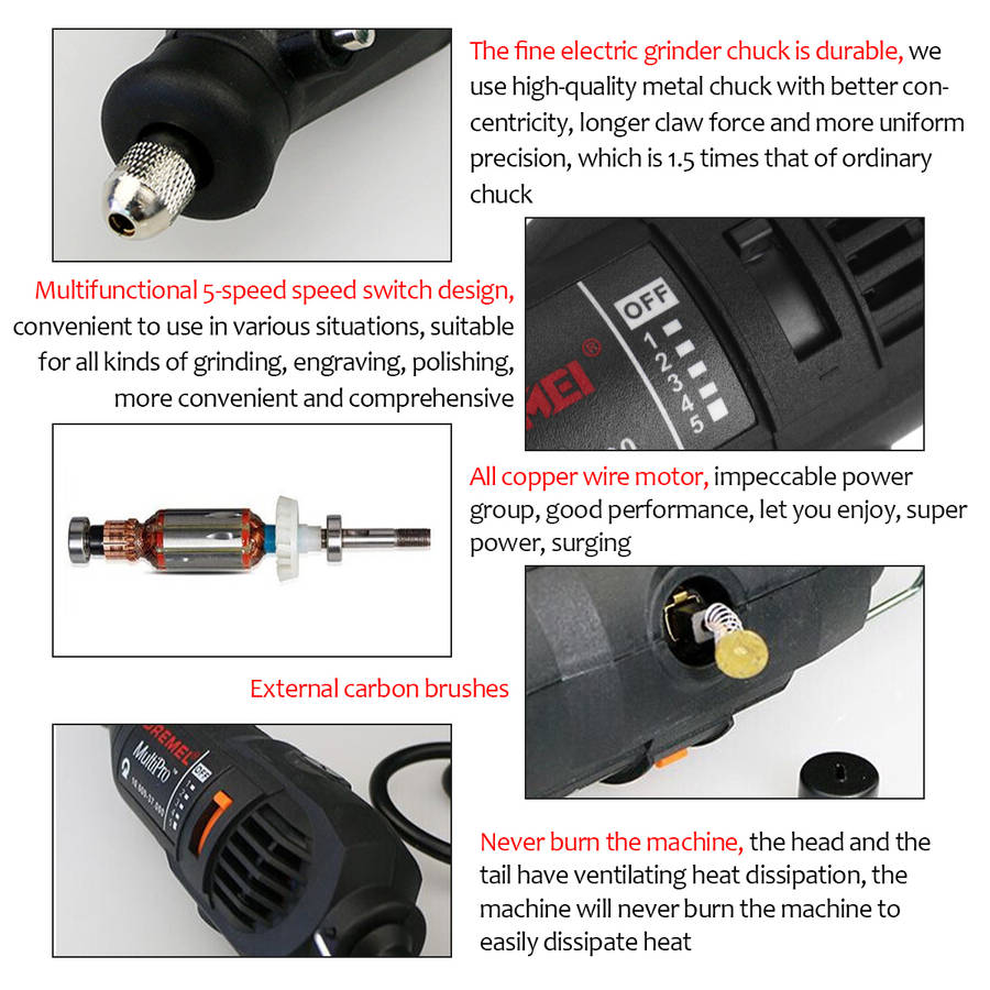 Features: a The fine electric grinder chuck is durable, we use high-quality metal chuck with better concentricity, longer claw force and more uniform precise, which is 1.5 times that of ordinary chuck. a Multifunctional 5-speed speed switch design, convenient to use in various situations, suitable for all kinds of grinding, engraving, polishing, more convenient and comprehensive. a All copper wire motor, impeccable power group, good performance, let you enjoy, super power. a External carbon brushes, which are more easily replaced by external carbon brushes, precise and high-quality all-copper carbon brushes, imported carbon brushes, not easy to wear. a Never burn the machine, the head and the tail have ventilating heat dissipation, the machine will never burn the machine to easily dissipate heat.
