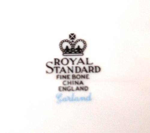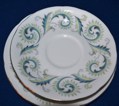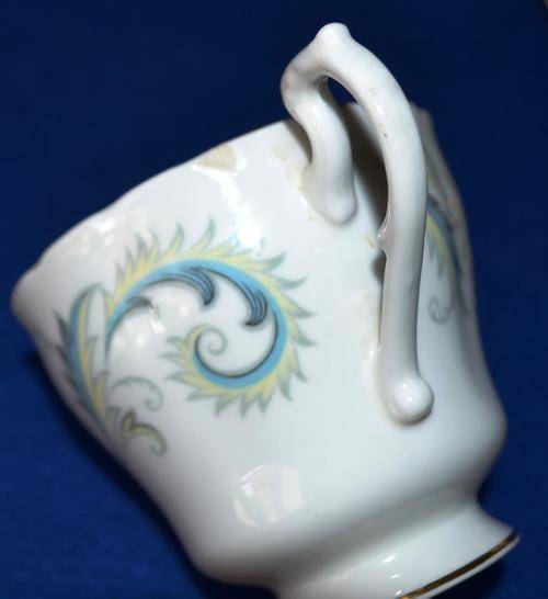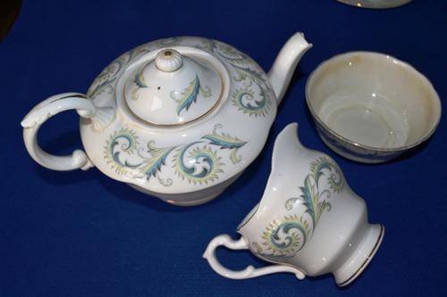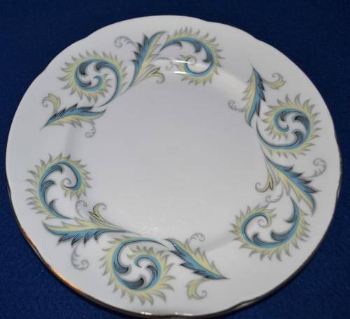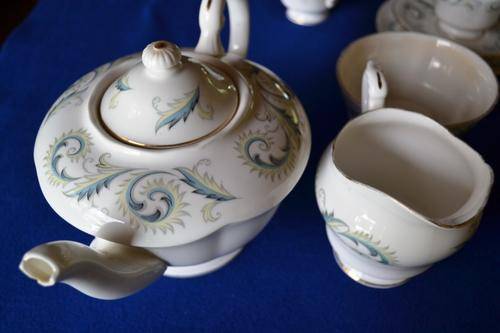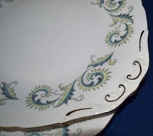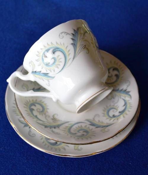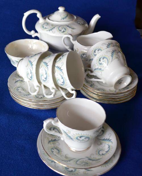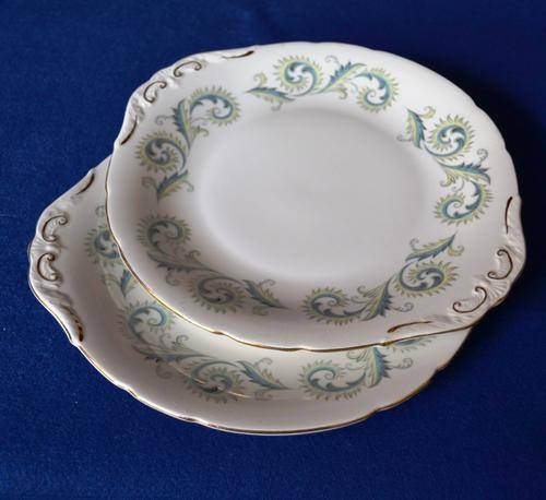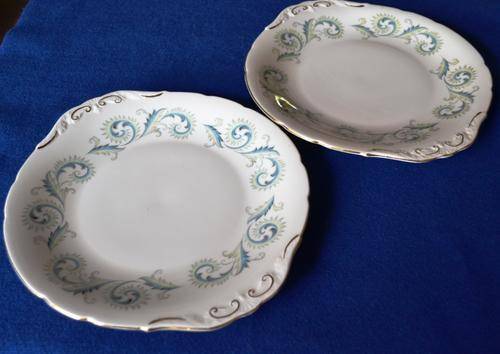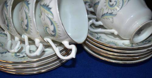 six cups (one cup has a small chip), six saucers and six small cake plates