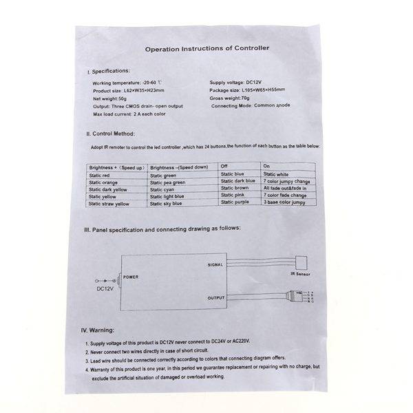 Description: 24 Key Mini IR Remote Controller For 3528 5050 RGB LED Strip Light DC 12V Mini 24 key IR remote controller Connection mode: Common Anode(+) Input Voltage: 12V Output Voltage: 12V Max load current:2A each color Working Temperature: -20°C-60°C Remote controller dimension: 85mm x 52mm x 6mm Remote controller battery 3V: 1xCR2025(Excluding) Package Include: 1x Mini IR controller 1x 24 keys remote controller 1x User Manual
