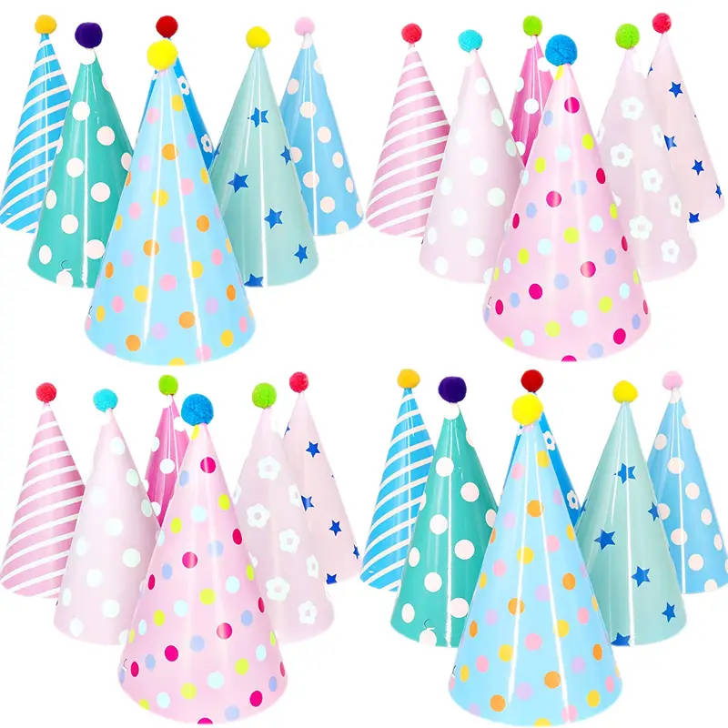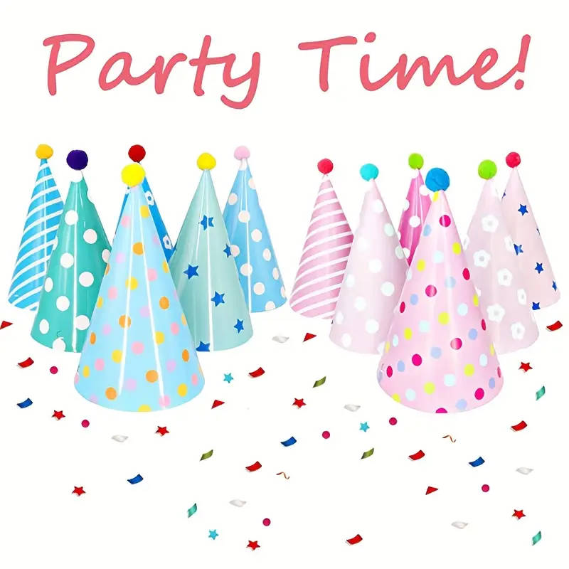 [24pcs Party Hats] 24pcs Colorful Party Hats Set | Pom Pom Paper Hats for Birthday, First Year Decoration, Party, Polka Dot, Stripe, Flower Party Decorations