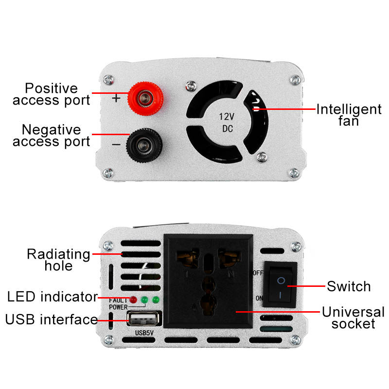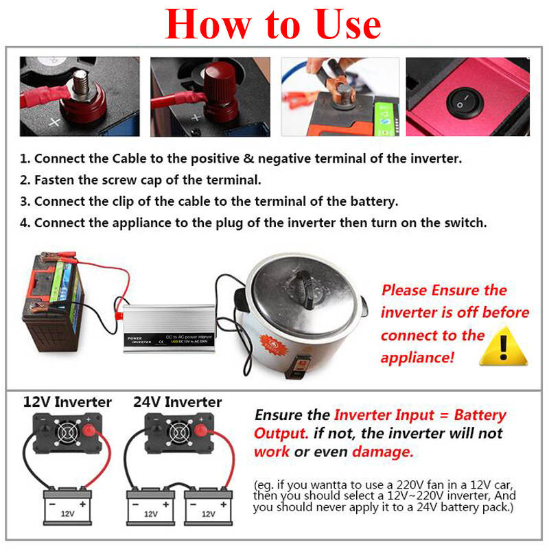 Package Included: 1x Inverter 1x CIigarette Lighter 1x Alligator Clip 1x User Manual ? Specification: Name: Inverter Power: 4000W Type: 12V to 220V Output Voltage: 220V Input Voltage: 12V Output Waveform: Modified Sine Wave Indicator light: Green power indicator, red fault indicator Cooling: Fan The shell maximum working temperature: <75a?? Size: 170*91*55mm ? Features: - A truly powerful inverter. Especially suitable for campsites, road trips or any place where DC to AC inverters are required. - This inverter can safely power your TV, air bed pump, or just charge your laptop, mobile phone, tablet,etc. Make sure you stay connected while you are traveling with the world. - Ultra-compact and lightweight: The strip-sized design saves space and is easy to store and carry. - Rugged construction: Durable housing provides advanced fall protection. An integrated cooling fan helps reduce heat and prevent shortages. - Apply in car, marine,solar electric power/wind electric power, motive office,emergency work, outwork.