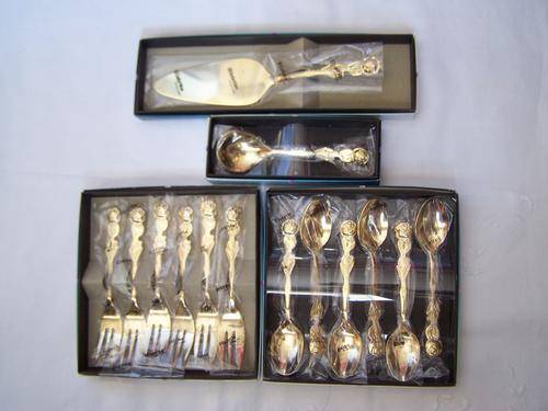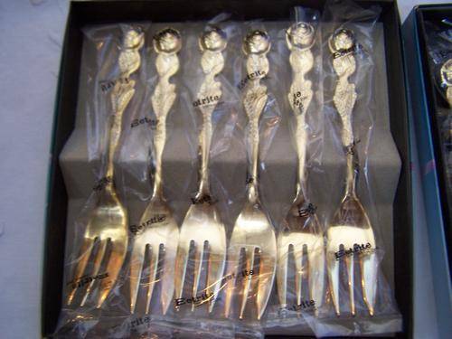 24k Gold Plated EETRITE set, 6 Cake forks, 6 Tea spoons, 1 Sugar spoon, 1 Cake lifter. All still in plastic and in boxes, NEVER USED.