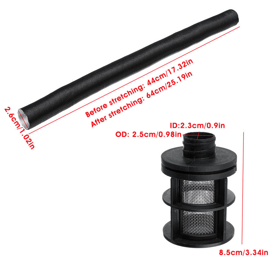 Specification : Quantity: 1 Set Main Color : black Model number : E13146 Material : metal & plastic Condition : 100% Brand new Air Filter Height : 8.5cm/3.34in Pipe After stretching: 64cm/25.19in Pipe Inner Diameter : 2.6cm/1.02in Air Filter Inner Diameter: 2.3cm/0.9in Pipe Before stretching: 44cm/17.32in Product name : air filter & intake pipe kit Air Filter Outer Diameter : 2.5cm/0.98in Fitment : For Webasto Eberspacher Diesel Parking Heater (Please Compare With Your Original One Before Purchasing!) Package included : 1 X Air Filter 1 X Intake Pipe 2 X Clamps Note : 1.There is no instruction included.Professional Install is Highly Recommended! 2.Please allow 0.5-1 inch difference due to manual measurement.(1inch=2.54cm). 3.The color of the actual items may slightly different from the listing images due to different computer screen, thanks for your understanding.