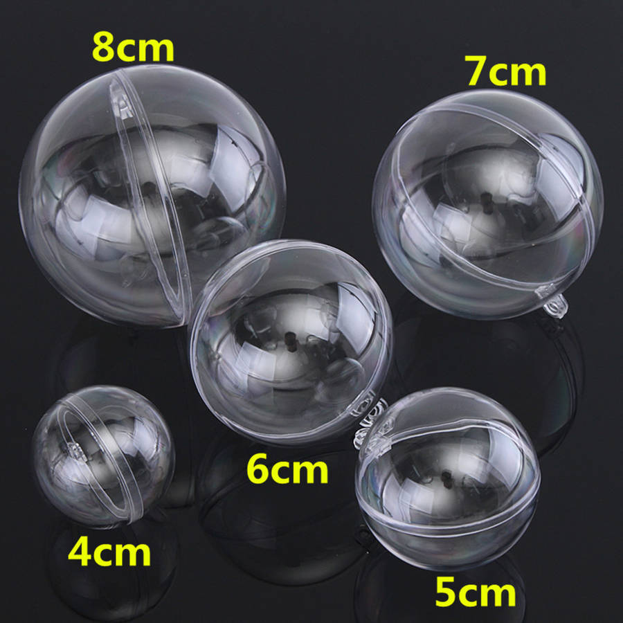 Package weight: 0.36 kg Specifications: Type:Ball shape Material:Plastic Color:Clear Ball shape Width:40mm,50mm,60mm,70mm,80mm Features: 1. Made of hard plastic, clear and besutiful. 2. Each of the heart come in two halves and is ready to snap open and fill. 3. Can resiste some certain pressure and be recycled for more use. 4. Convenient to use, high sealing performance, and can be hung How to make bath bomb: 1. Gather your supplies 2. Combine dry ingredients 3. Combine the liquid 4. Mix liquid and dry ingredients together 5. Pack mixture into molds 6. Compact the mixture into mold 7. Tap slightly around the mold 8. Gently remove the bath bomb 9. Let bath bomb dry Package included: 25Set × Ball Shape Molds (Each mold has two pieces)