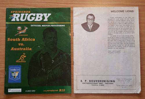Below : Rugby programmes : SA vs Australia 2003 at Newlands (some creasing on cover), SPRINGBOKS vs THE BRITISH LIONS - SECOND TEST 1974 - COVER MISSING - THE REST OF THE PROGRAMME IS IN VERY GOOD CONDITION - CONTAINS PICTURES OF THE BRITISH LIONS AND SPRINGBOK PLAYERS.