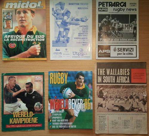 Below : 'Midol' - French rugby magazine (50 pages) with articles on Springbok rugby, Francois Pienaar and Nick Mallet, rugby programme : Benetton Treviso vs Ros Roma 2001, Petrarca rugby news - Italian rugby magazine 22/09/2001, Rugby World Cup 1995 - post tournament supplement to a 1995 'Huisgenoot' magazine : 12 pages featuring South Africa's games and moments after the final whistle - also pictures of the Springbok and All Black players who played in the final, 1995 Rugby World Cup book - pre tournament (80 pges) - mint condition, The Wallabies in South Africa 1963 - supplement (12 pages) to a 1963 'Personality' magazine (half of the last page missing) - contains pictures of the games played by the Wallabies on their tour to South Africa.