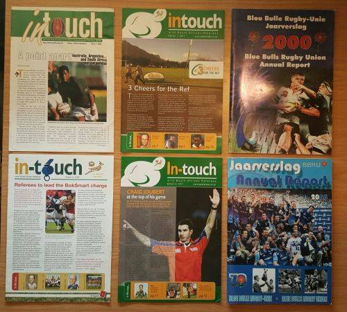 Below : Four 'In Touch' South African referee magazines, Blue Bulls annual report 2000 (49 pages), Blue Bulls annual report 2008 ( 82 pages) - both reports contain pictures of all the Blue Bulls rugby teams, club teams, school teams, etc.