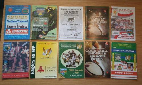 Below : 10 Rugby programmes : Northern Transvaal vs Eastern Province 1994 (two holes punched near spine), Eastern Province vs Griffons 2004, SA vs England 2000 (centre page creased), Coca Cola under 16 Grant Khomo week 2008, Griffons vs Western Province 2011, Stormers vs Reds 2000, SWD Eagles vs Western Province 2004, SWD Eagles vs Eastern Province 1998, Coca Cola under 18 Craven Week 2008, SWD Eagles vs the Lions 1999