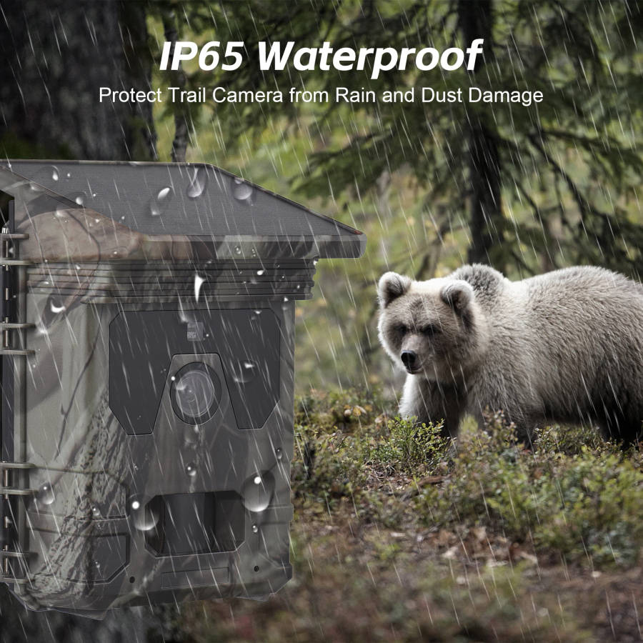 Solar-powered trail camera with built-in lithium battery, perfect for wildlife monitoring, outdoor deer hunting, and home security. Say goodbye to frequent battery replacement. Capture Ultra-clear 4K videos and 50MP pictures, day or night. Equipped with passive infrared sensors (sensitive PIR sensors), this trail camera can capture wildlife in just 0.3s when motion is detected. This solar trail camera supports a memory card of up to 256GB, allowing you to take more pictures and videos. This solar trail camera with 32GB memory card is the best gift for hunters.