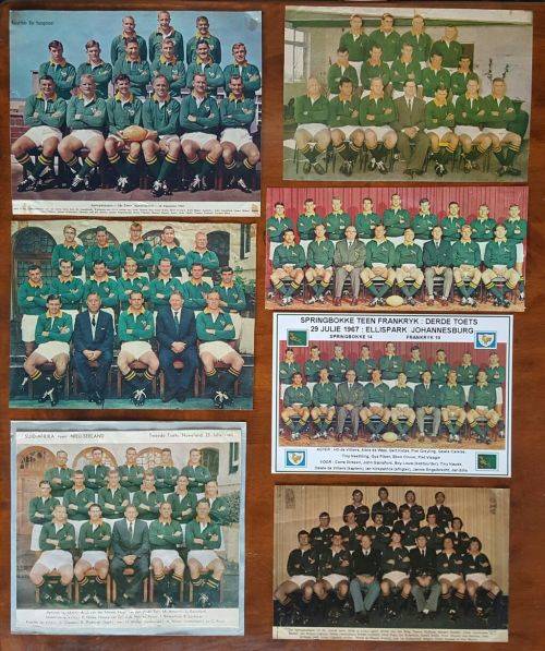 Below : 'Huisgenoot' magazine pictures of the following Springbok teams : vs Australia - 3rd test 1963 (largest picture on this page : 305mm x 250mm), vs British Lions - 4th test 1962, vs Australia - 2nd test 1963, vs France - 3rd test 1967 (magazine picture plus A4 size gloss photo print with names of players - the latter not a high quality photo), vs NZ - 2nd test 1960, vs NZ - 2nd test 1976.