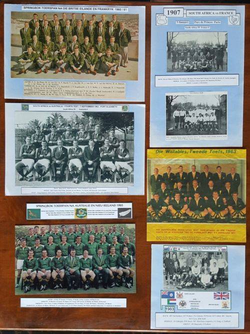 Below : Springbok team to the British Isles and France - 1960/61, pictures of the Springbok and French teams who played against each other on 03/01/1907 in Paris, SA vs Australia - 4th test 1963, Australian team - 2nd test 1963 vs SA, gloss photo (300mm x 170mm) of the 1965 Springbok team who toured Australia and NZ (printed heading and names of players included), SA vs Britain - 3rd test 1903. The first three team pictures are glued to scrapbook pages measuring 330mm x 230mm.