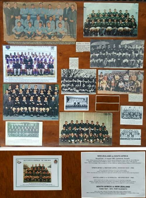 Below : Newspaper picture of a 1960's Northern Transvaal team who played against Transvaal in the Currie Cup competition (400mm x 230mm - largest picture on this page), SA vs NZ - 1st test 1976, Griffons Vodacom Cup team - 2005 (laminated), newspaper picture - SA vs France - 2nd test 1975, All Black team vs SA - 2nd test 1965 (Huigenoot magazine picture), 1971 SA Combined Colleges team who played against the Pumas ( South America) in 1971, newspaper picture of the SA Quagga Barbarian team vs NZ - 1976, small postcard photo of a 1980's WP rugby team, Northern Transvaal team (co-winners of the Currie Cup 1989, SA team with reserves vs NZ - 3rd test 1970 (Huisgenoot magazine Sport Album series), two small pictures (120mm x 90mm) of Northern Transvaal Currie Cup winning teams - 1946 and 1977, picture of the Springbok team who played against Australia - 1992 - the picture is glued to a 240gsm board measuring 210mm x 150mm (the heading, logos and names of the players are printed on the board, sheet of paper with names of players for the team pictures without names.