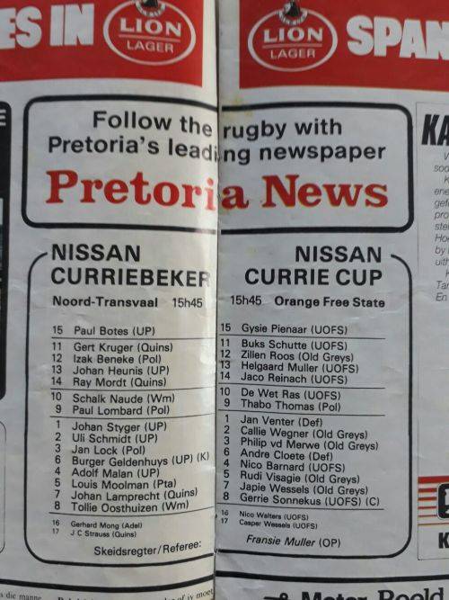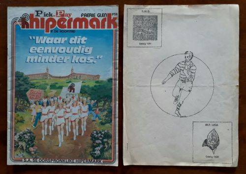 Below : Rugby program 1 : Northern Transvaal vs Orange Free State - 1984 in Pretoria. Program 2 : South Western Districts vs WP Liga. Year unknown. Kabous van der Westhuizen, Wilfred Cupido, Louis Blom and Jerome Paarwater are a few of the players who played for the WP Liga side. Both programmes is large format and still in good condition for its age.