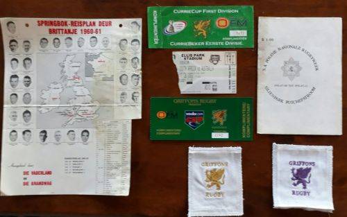Below : 1960/61 Springbok rugby tour itinerary (315mm x 240mm) - supplement to 1960 'Vaderland / Brandwag' magazine (some wear and tear on the right hand side of the item), 1991 SA Police National Rugby Week programme, one Griffons Currie Cup (first division) complimentary ticket, one Griffons Vodacom Cup complimentary ticket, South Africa vs Australia 17/08/2002 - Ellispark rugby ticket, two Griffons embroidered logo's from original rugby shorts (120mm x 95mm each) :