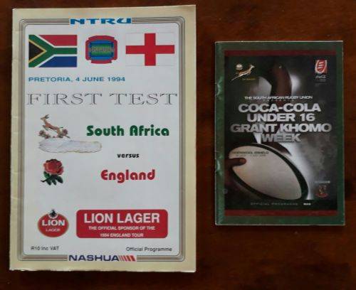 Below : Rugby programmes : 1. SA vs England - first test 1994 in Pretoria - large format, 64 pages. Except for a mark on the cover (below the Springbok logo), the program is in MINT condition. 2. Coca Cola under 16 Grant Khomo week - 2008. The program is in mint condition.