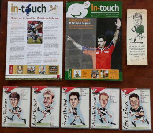 Below : Two South African referee magazines IN TOUCH (2009 edition 2 and 2011 edition 3), Johan Heunis (former Springbok) bookmark, five Natal Sharks postcards (Ollie le Roux, Stefan Terblanche, Henry Honiball, Gary Teichmann, Andre Joubert),