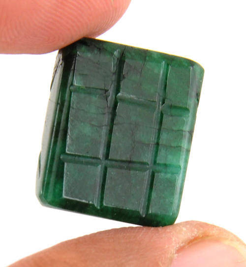 28.49 Carat Rectangular Natural Emerald Gemstone with Unique Carving from India - IGLI Certified