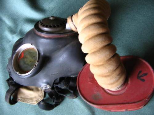 A 2nd WW gas mask in good condition. The rubber of the mask is showing some wear and one lens has been resealed and as a result is a bit misty. The rubber is marked "Normal" and "BFG 12/40. The khaki cloth that is part of the head straps is marked "I^G - No 4 II - L T 1937 53 - G". The canister has some scrapes and knocks but is generally good. On top it is marked "AT - 39/1/41" and also has a black arrow painted on it. Underneath it is marked "No 4 A - B.W.&M. Ltd. - 1940 - V4 - E VI". The canvas holder is grubby and used looking but is intact and still has the cord ties attached. A nice item. Postage with tracking number R 50.00 Payment Bobpay EFT.
