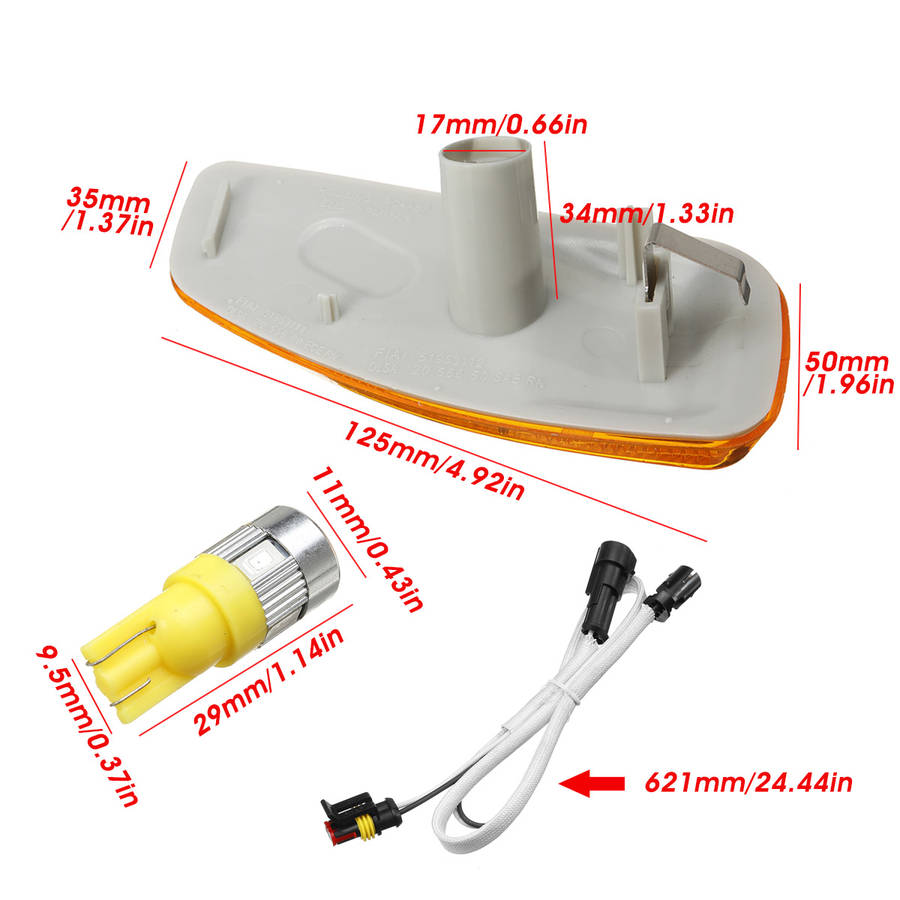 B83471 Light Bulb: T10 Product Name: Side Marker Lights Material: ABS Plastic & LED Light Color: Yellow Shell Color: Yellow / White / Smoked Black (Please let us know the color youad like,You can leave the message on your Paypal note to tell us.) Manufacturer Part Number: 68256050AA, 68256049AA, CH2550134, CH2551134 Voltage:12V Shell Size: 125mmx50mm Wiring Harness Length: 621mm Quantity: 2pcs (Left+Right)