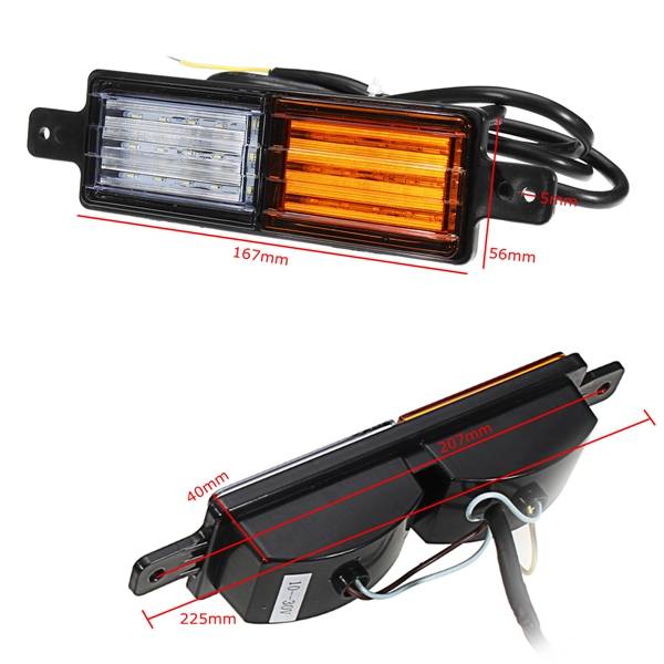 Light Color: White and Amber Material: Polycarbonate lens and ABS plastic housing Voltage: DC 10-30V Power: 1.8W Light Color: White+Amber LEDâs Number: 30 LED(15 White + 15Amber) Size: 167 x 56 x 40mm Total Length: 225mm Distance Between Two Mount Hole: 207mm Mounting Hole Size: 5mm Wire Length: 162cm Wire Connection: White Wire - Negative Yellow Wire - Indicator Brown Wire - Front Clearance