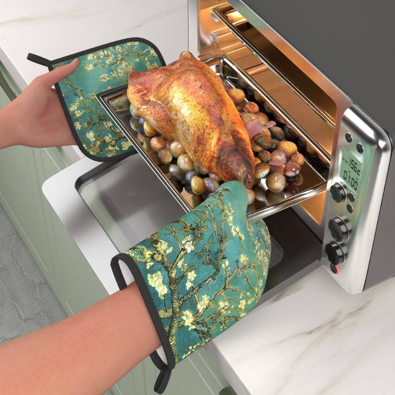 2pcs Blooming Almond Tree Branches Oven Mitt Set Heat Resistant Polyester Kitchen Gloves and P