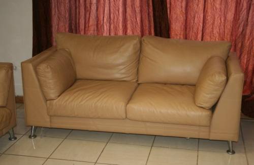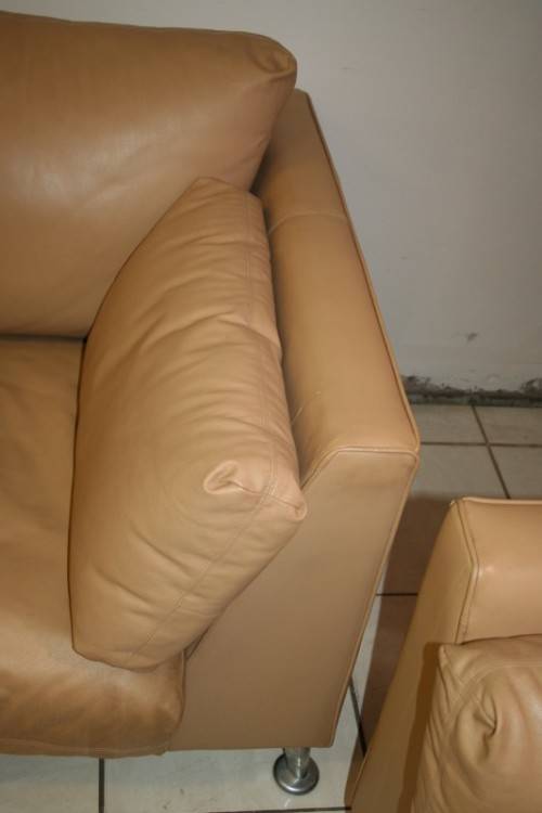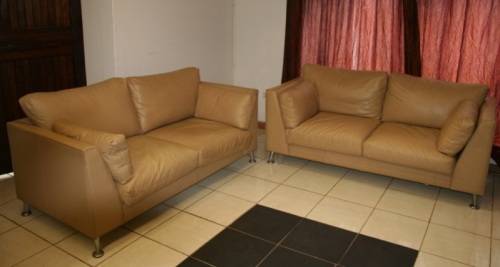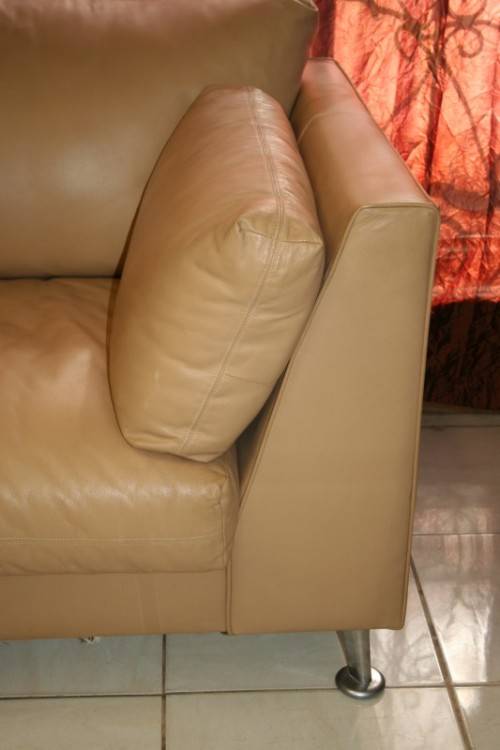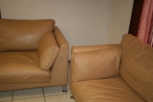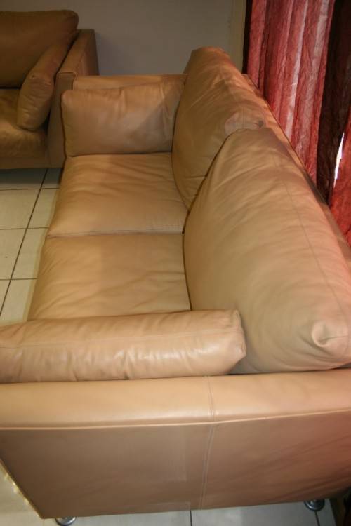 THESE TWO SUPERB X-LARGE MODERN STYLED SAND BEIGE GENUINE LEATHER COUCHES ARE IN EXCELLENT CONDITION AND HAVE ABSOLUTE MINIMAL USAGE RELATED WEAR AND TEAR. THESE ARE GENUINE LEATHER AND NOT BONDED LEATHER COUCHES. THE STYLISH COUCHES ARE ON STYLED CHROMED LEGS. EACH OF THE COUCHES MEASURES A VERY DECENT 1870mm LONG x 900mm WIDE x 720mm HIGH. THEY ARE IDEAL FOR A LARGE FAMILY ROOM OR ENTERTAINMENT ROOM OR EVEN AS COUCHES IN AN OFFICE RECEPTION AREA. THE COUCHES ARE VERY WELL MADE AND ARE QUALITY EXPENSIVE LEATHER COUCHES. PLEASE VIEW THE PICS CAREFULLY TO FULLY APPRECIATE THESE TWO AWESOME MODERN LEATHER COUCHES AND TO CONFIRM THEIR CONDITION.