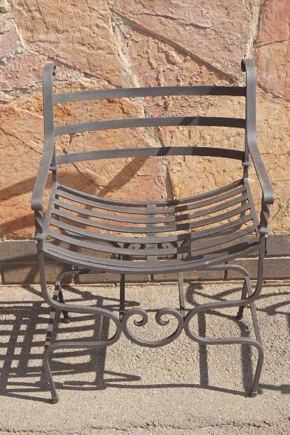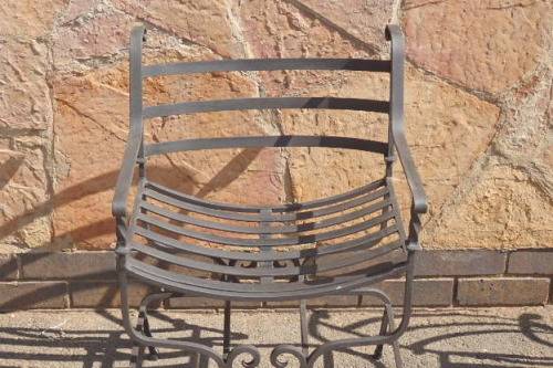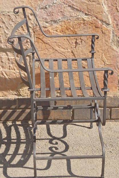 THESE TWO SUPERBLY MADE AND SOLIDLY BUILT WROUGHT IRON "CARVER" STYLE DINING CHAIRS ARE IN STUNNING CONDITION WITH ABSOLUTE MINOR AGE AND USAGE RELATED WEAR AND TEAR. THE CHAIRS HAVE STUNNING WEIGHT TO THEM AND ARE PERFECT ON THE ENDS OF A PATIO TABLE OR AS COMFORTABLE CHAIRS ON A PATIO OR POOL DECK ETC. THE CHAIRS ARE ROUGHLY 545mm LONG x 450mm DEEP x 770mm HIGH. THERE ARE NO CUSHIONS ON THESE CHAIRS.