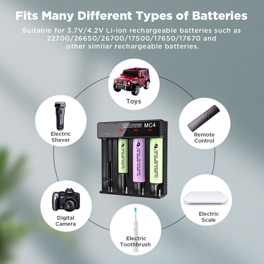 | Suitable for | 3.6V/3.7VLi-ion/IMR/INR/ICR 10440/14500/14650/RCR16340/16650/17500/17650/17670/18350/18490/18500/18650, 20700,21700,22700,26650,26700(Note: 21700/20700 can be filled with belt protection plate) |