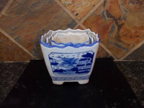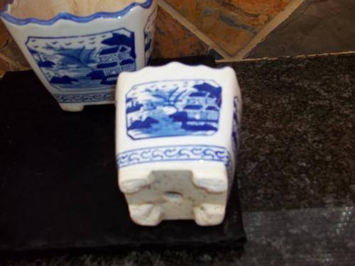3 BLUE AND WHITE SQUARE PLANTERS