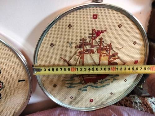*lovely for the collector 2 steel tapestry ring frames have woven wood with tapestry on note both have custom holes in middle steel