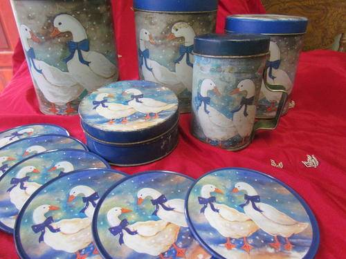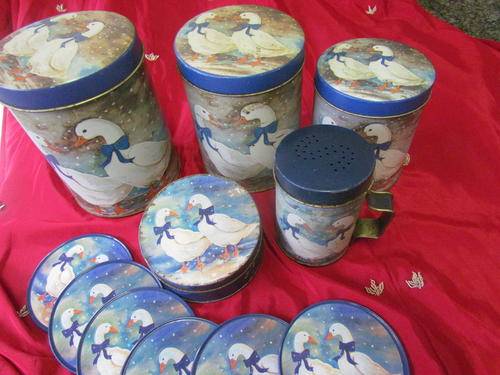 3 GEESE TINS, A SALT SHAKER AND 6 COASTERS IN A TIN!!
