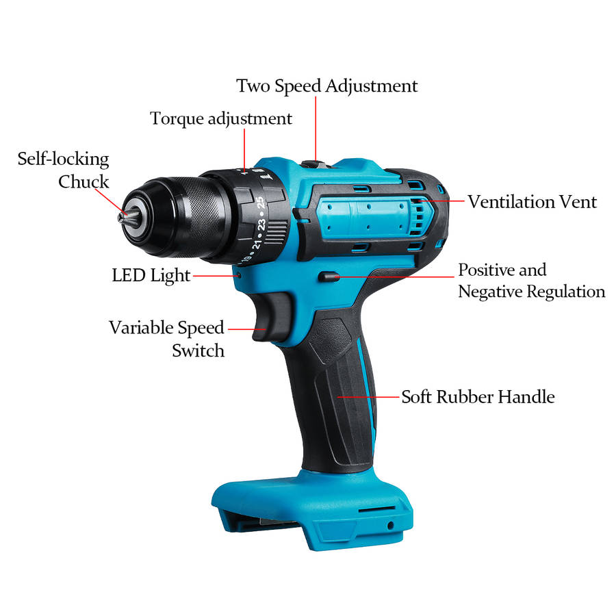 Features: - Lock the bit through the rotating chuck. - 2-speed function, the machine top one key switch. -The speed control switch increases with the increase of the speed. - Clockwise & anticlockwise rotation, only a slight push can be done. - LED lights, convenient in the dark working environment. - Precise control for drilling wood, metal, wall and all screw driving. - Smart and high efficiency, stepless speed change, high torque function - Ideal for DIY, home and general building, engineering using, etc.
