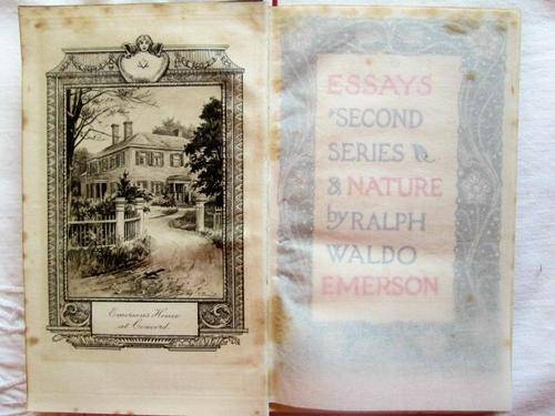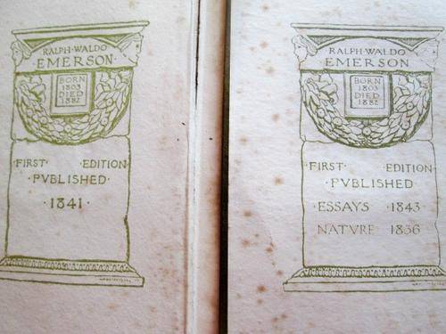 THESE 3 RARE BOOKS ARE STILL IN GOOD CONDITION FOR THEIR AGE. BOUND IN SOFT LEATHER.TWO ARE: ESSAYS - FIRST SERIES FIRST EDITION PUBLISHED IN 1841. THE COVER AND 1ST TWO PAGES ARE LOOSE. - SECOND SERIES -FIRST EDITION PUBLISHED 1843 & NATURE 1836. THE FRONT PICTURE PAGE IS STILL PROTECTED WITH TISSUE PAPER. THE THIRD BOOK IS CALLED REPRESENTATIVE MEN - FIRST EDITION PUBLISHED IN 1850. THERE IS SOME FOXING IN THE FRONT, BUT THE CONTENT PAGES ARE IN VERY GOOD CONDITION. SIZE - 15CM X 9.5 CM WITH 270 PAGES EA.