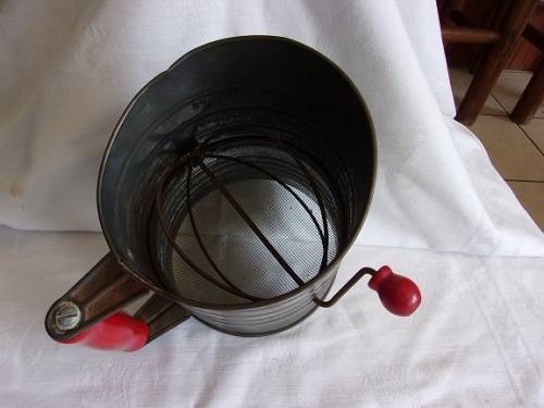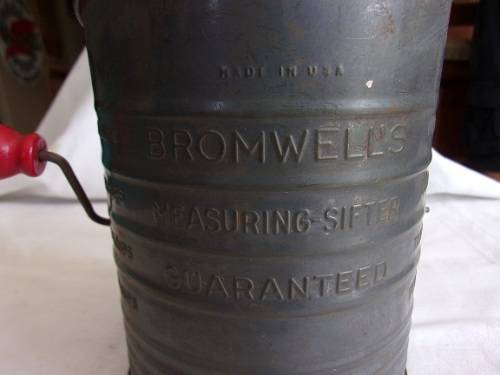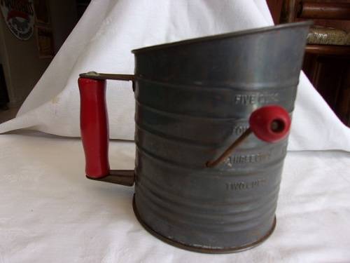 Vintage Bromwell's Measuring-Sifter. This old sifter would have been produced in the USA in the 1930s. It is a 5 cup tin flour sifter with a metal crank and red wooden handle.The side of the sifter is marked to measure 5 cups. It is in great working condition.